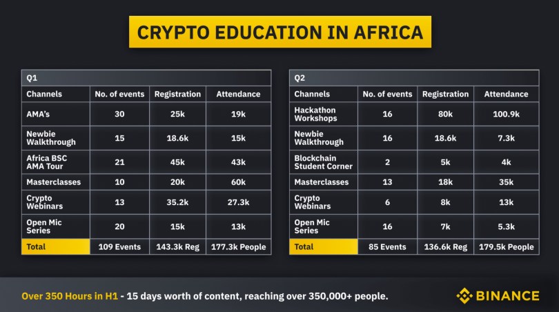Seit wir in die Kryptosphäre eingetreten sind, haben wir uns immer bemüht, an der Spitze der Blockchain-Ausbildung zu stehen, Krypto-Neulinge mit der Binance Academy auszustatten, einem One-Stop-Leitfaden für alles, was mit Krypto zu tun hat, und kontinuierliche kostenlose Krypto-Ausbildung in Afrika anzubieten, wo Krypto Interesse und Akzeptanz nehmen weiter zu.
