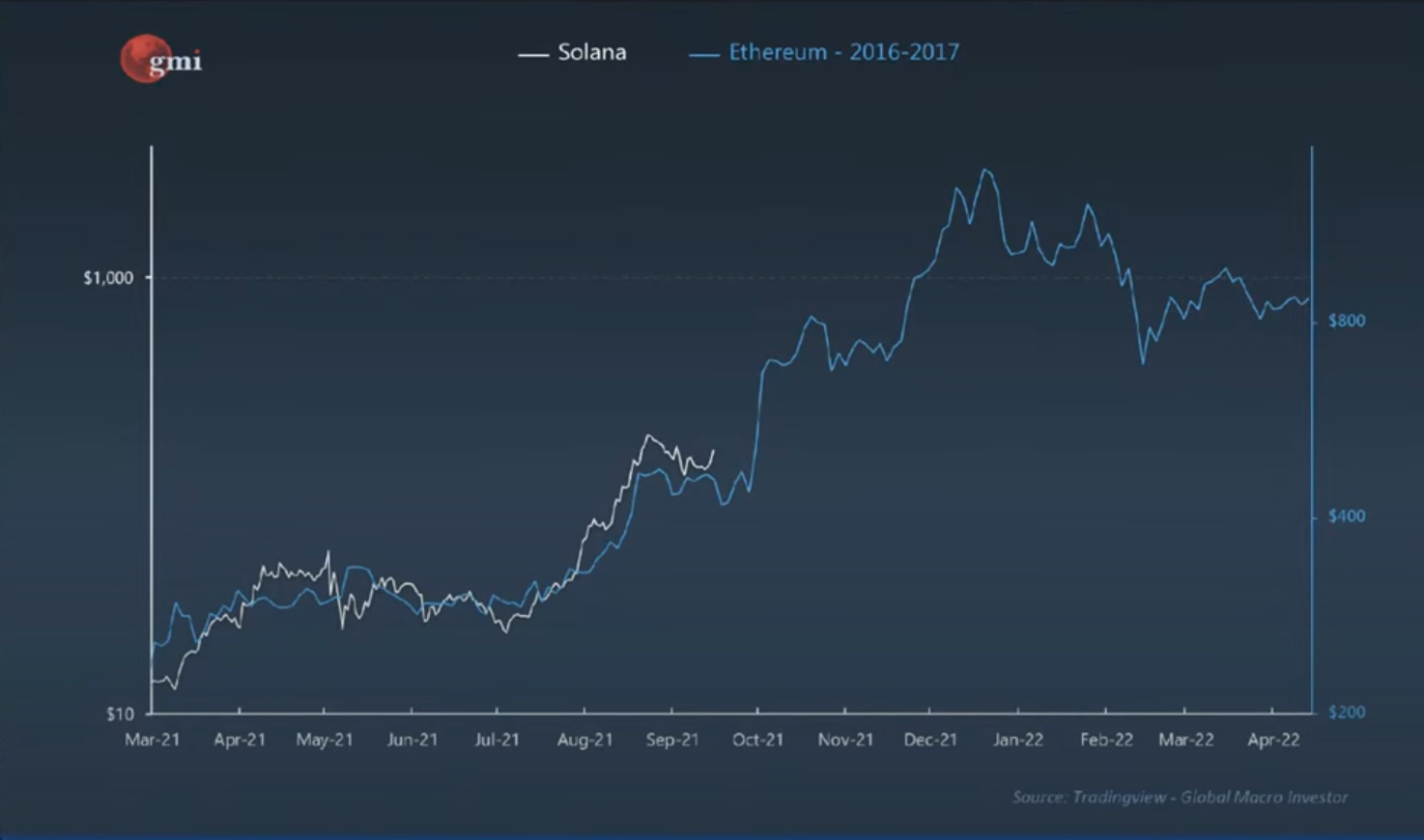 Schließlich zeigt Pal ein Diagramm an, das zeigt, wie die Smart-Contract-Plattform Solana (SOL) denselben Weg einschlägt Ethereum in den Jahren 2016-2017 getan hat, was bei Fortsetzung im April 2022 SOL über 800 USD bringen würde.