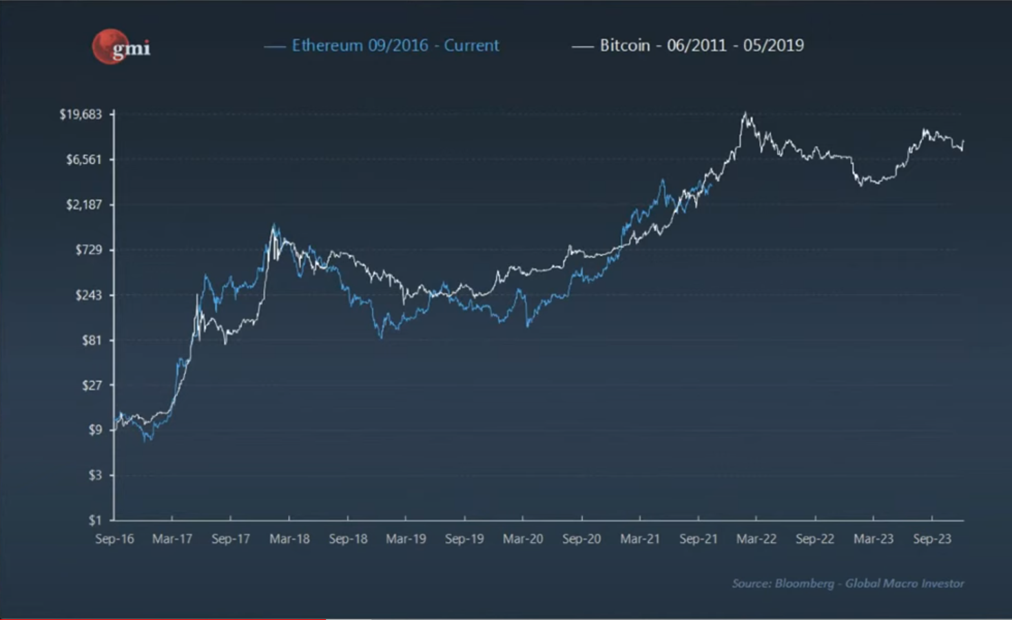 Der ehemalige Goldman Sachs-Manager zieht dann ein weiteres Diagramm hoch, das vergleicht EthereumPreisentwicklung von 2016 zu Bitcoin von 2011 bis 2019.