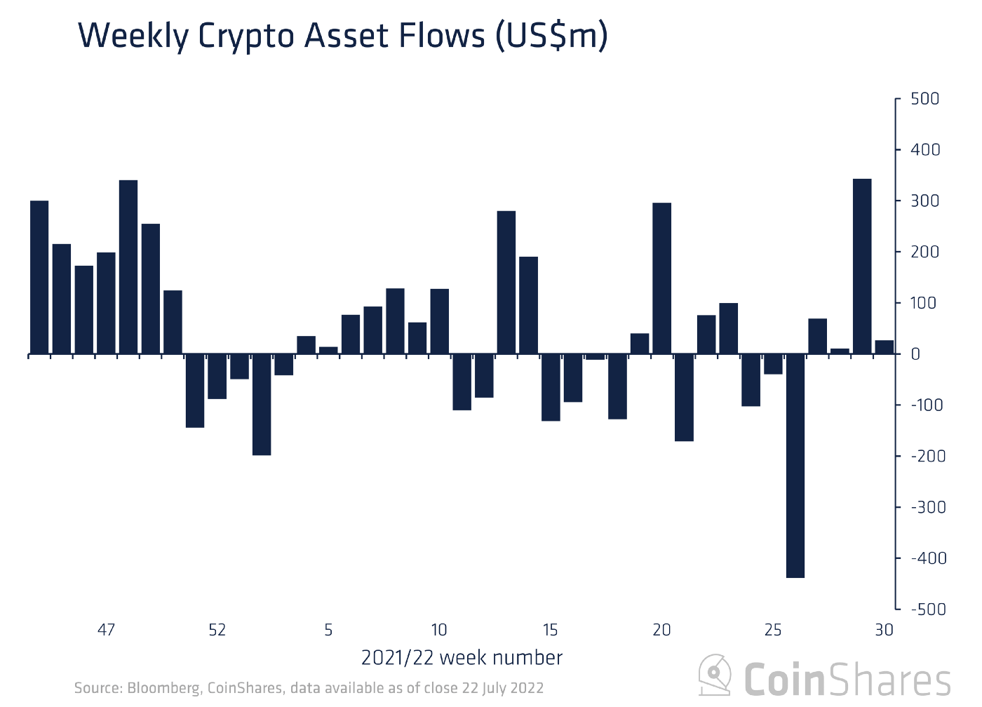 „Investmentprodukte für digitale Vermögenswerte verzeichneten letzte Woche Zuflüsse in Höhe von insgesamt 30 Millionen US-Dollar, während die verspätete Meldung von Trades aus der Vorwoche dazu führte, dass die Zuflüsse von 12 Millionen US-Dollar auf 343 Millionen US-Dollar korrigiert wurden, was die größte Einzelwoche mit Zuflüssen seit November 2021 darstellt.“