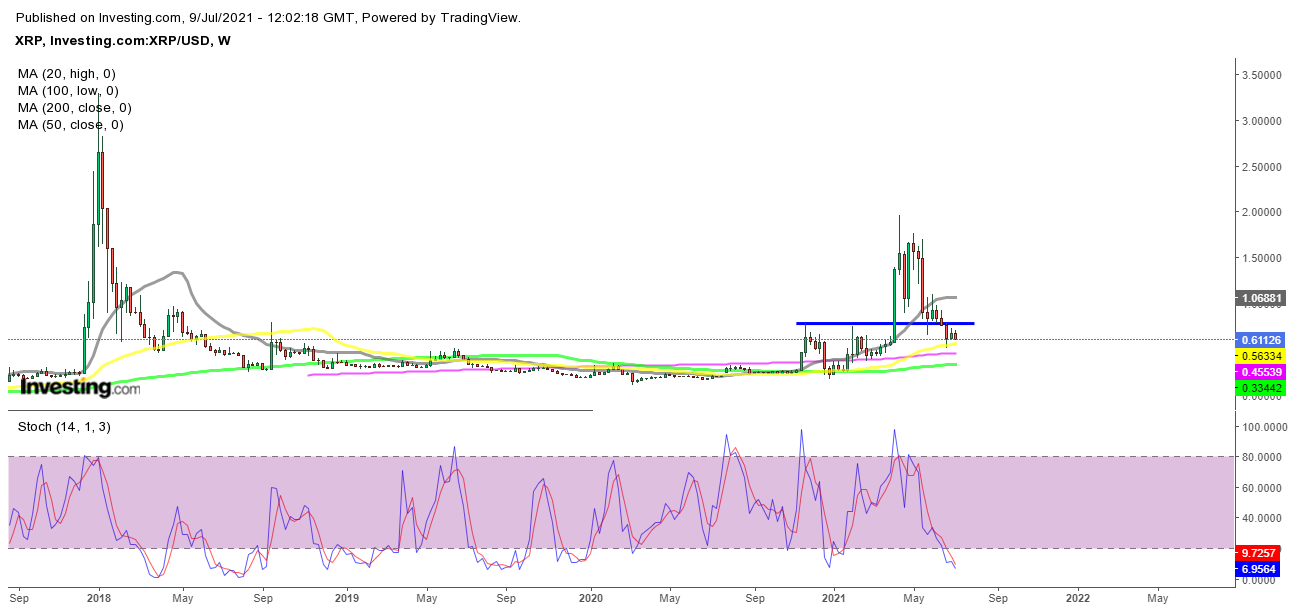 Der Preis ist unter die Höchststände des vierten Quartals 2020 gefallen, die im Mai als Unterstützung dienten, also ist dies ein weiteres bärisches Zeichen. Aber der 50 SMA (gelb) hat sich jetzt auf dem Wochen-Chart in eine Unterstützung verwandelt, so dass die Möglichkeit besteht, dass wir von hier aus eine Erholung sehen. Wir hoffen, dass XRP/USD bald zinsbullisch wird, da wir bereits von weiter oben long sind und der stochastische Indikator bei diesem Paar überverkauft ist, was zeigt, dass der Verkauf möglicherweise seine Grenzen erreicht hat.