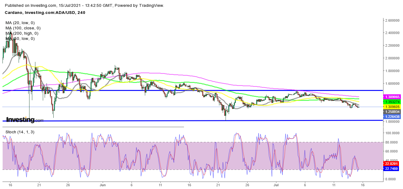 Diese gleitenden Durchschnitte wurden zu Unterstützung und hielten etwa einen Monat bis Mitte Juni, als die zweite Panikwelle den Kryptomarkt wieder nach unten schickte und die meisten Kryptowährungen neue Tiefststände erreichten. Die Hochs in Cardano wurden niedriger, so dass der Durchbruch keine große Überraschung war, aber der 200 SMA (violett) hielt als Unterstützung auf dem Tages-Chart und nach einer Doji-Kerze die ADA/USD höher gesprungen.