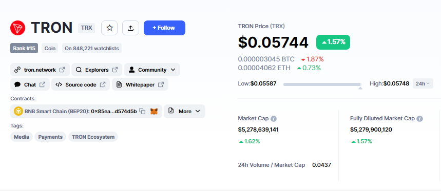 Nach CoinMarketCapder Preis von TRX ist in den letzten sieben Tagen um 11 % gestiegen und wird zum Zeitpunkt des Schreibens bei 0,05744 $ gehandelt.