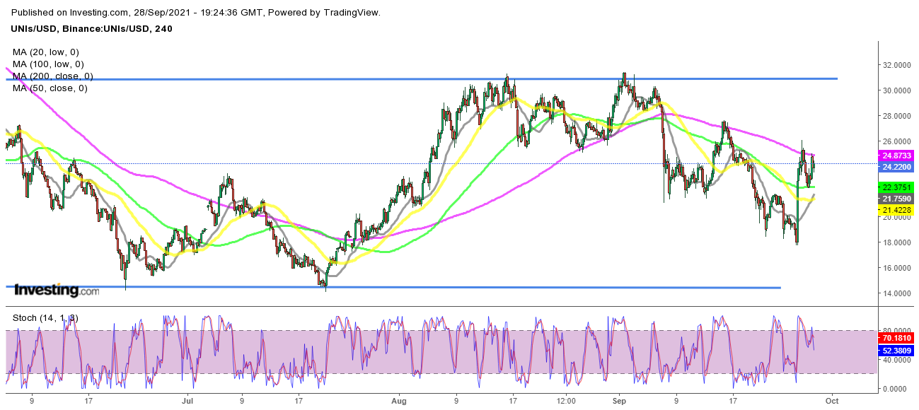 In den letzten Tagen hat es jedoch Widerstandsfähigkeit gezeigt, während der Markt rückläufig war. Das Durchgreifen in China hilft tatsächlich den Uniswap Börse, da Händler und Investoren ihre Krypto-Reserven an dezentrale Börsen transferieren. Das Verbot in China und anderen Ländern betrifft nicht dezentrale Börsen, während Uniswap und dergleichen profitieren.
